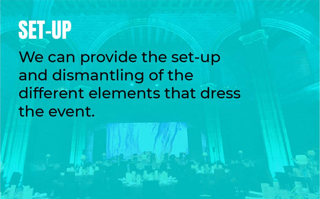 We offer customized integral solutions for any type of event and client. The commitment and involvement in any project are complete and to any level, from its initial concept until the last production detail.